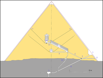 “Two successive intended burial chambers were constructed in the body of the pyramid, the final one lying at the end of an impressive corbel-roofed passage, which seems originally to have been intended simply as a storage-place for the plug-blocks of stone that were made to slide down to block access to the upper chambers after the burial. Corbel-roofing, where each course of the wall blocks are set a little further in than the previous one, allowed passages to be rather wider than would have been felt to be safe with flat ceilings, and are a distinctive feature of the earliest pyramids and tombs of the Fourth Dynasty, to which Khufu belonged. |::|