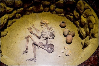 “In Badarian burials, corpses were generally contracted on their left side with heads positioned south, facing west, and with hands clasped in front of the face. Bodies were carefully laid upon a mat and wrapped in animal skins, with occasional addition of a pillow made from straw or rolled-up animal skin.