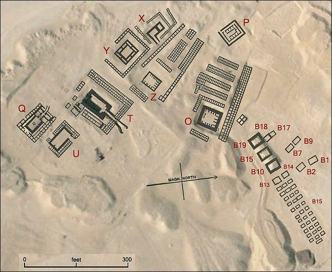 “When the royal necropolis was moved back to Abydos in the reign of Sekhemib/Peribsen (again, for unknown political and/or religious reasons), the design of the king’s tomb likewise reverted to a 1st-Dynasty model. But this may have been driven as much by geology and the absence of locally available high-quality building stone as by theological influences. Khasekhemwy seems to have aiming at a compromise design in his tomb at Abydos, which was built largely of mud brick (in 1st- Dynasty fashion), but with a longitudinal layout incorporating galleries of storage chambers (like the early 2nd-Dynasty royal tombs at Saqqara). His program to re-unite Lower and Upper Egypt and their distinct cultural traditions, announced also in the dual form of his name (Khasekhemwy, “the two powers have appeared”), was further emphasized in his construction of vast funerary enclosures at Hierakonpolis, Abydos, and Saqqara—the three most prominent ancient centers of royal mortuary and ceremonial architecture. The “Fort” at Hierakonpolis and the Shunet el- Zebib at Abydos stand to this day as the world’s oldest mud brick buildings. Khasekhemwy’s stonebuilt enclosure at Saqqara—assuming, as seems almost certain, that the Gisr el-Mudir is to be dated to his reign—is now much denuded, but its scale far surpasses that of its southern counterparts.