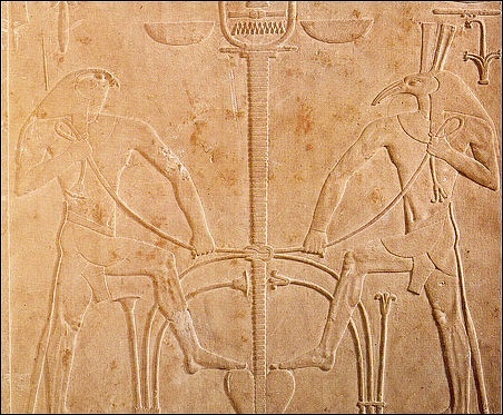 “Geb's words to the Nine Gods: "I have appointed Horus, the Firstborn, Him alone, Horus, the inheritance. To the Son of My Son, Horus, the Jackal of Southern Egypt...the First-Born Horus, the Opener of the Ways." Then Horus stood over the land. He is the uniter of this land, proclaimed in the Great Name Ta-tenen, South of His Wall, Lord of Eternity. Then sprouted the two Great Magickians upon His head. He is Horus who arose as King of Upper and Lower Egypt, who united the Two Lands in the Nome of the Wall, the place in which the Two Lands were united. Reed and papyrus were placed on the double door of the House of Ptah. That means Horus and Seth, pacified and united. They fraternized so as to cease quarrreling in whatever place They might be, being united in the House of Ptah, the Balance of the Two Lands in which Upper and Lower Egypt had been weighed.”