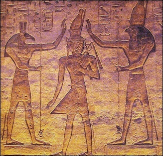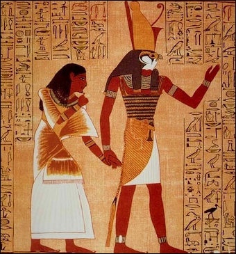 “Horus (Haroeris, Harpocrates, Harsiesis, Re-Harakhty) was originally the sky-god and was introduced the Great Ennead, giving the group nine members. He was identified with the living king. There are many stories of his battles with Seth. He was raised by his mother to avenge his father's murder, After a struggle that lasted 80 years, Horus defeated Seth and became the king of Egypt. The eye of Horus — which represents strength, vitality and self-sacrifice — came from a myth in which Horus gave up his right eye in battle with Seth. [Source: Minnesota State University, Mankato, ethanholman.com, +\Barbara Waterson, BBC, March 29, 2011]