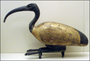 Martin A Stadler of the University of Wuerzburg wrote: “Thoth’s manifestations are of two main types: as an ibis or ibis-headed man, and as a baboon. On Pre- and Early Dynastic palettes the king is accompanied by a series of standards. Often on one of them stands an ibis designated as the Lord of Hermopolis, i.e., Thoth, in his later, canonized form. The typical writing of “Thoth” in the Pyramid Texts is the ibis on a standard ), which suggests that the ibis is already the deity’s normal iconography as early as the Old Kingdom. Therefore these early depictions could also be interpreted as attestations of Thoth. For example, a rock relief from the Sinai, carved during one of the mining expeditions of Khufu’s reign, shows the king smiting an enemy in front of an ibis- headed god. This would be the oldest known depiction of Thoth in ibis-headed form. However, there is no caption specifying identity, which leaves some uncertainty, because in Egypt a deity can take different shapes, or a certain shape can be taken by different deities. Accordingly, in most cases the ibis does denote Thoth, but very rare exceptions do occur. It is hard to say whether the ibis- iconography of deities other than Thoth always aims at assimilating the depicted god to Thoth—for example, the souls (bAw) of Hermopolis are shown as ibis-headed figures. That is certainly not a coincidence, Hermopolis being Thoth’s chief cult-center. Therefore, it may be speculated whether the representation of an ibis-headed goddess should be associated with Thoth, but this remains a hypothesis for which only circumstantial evidence can be adduced. [Source: Martin A Stadler , University o Wuerzburg, UCLA Encyclopedia of Egyptology 2012, escholarship.org ]