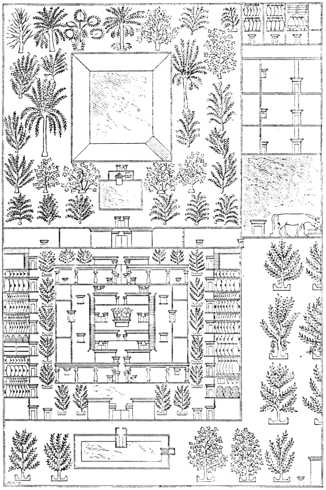 The form of the garden here given seems to have been that usual in the older periods. In the beautiful park laid out by the oft-named 'Amt'en, chief hunter to King Snefru, he had “dug a great tank and planted figtrees and vines. " “In the middle of the garden “(exactly as in our plan) “he made a vineyard, which yielded him much wine. " [Source: Adolph Erman, “Life in Ancient Egypt”, 1894]