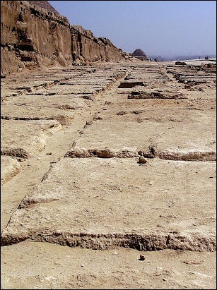 “The world’s oldest paved quarry road connects the Old Kingdom basalt quarries of Widan el-Faras with the shores of ancient Lake Moeris at Qasr el-Sagha in the Northern Fayum. Constructed from local sandstone, limestone, basalt, and fossilized wood, the terminus of the 11 kilometers road at a quay utilized the waters of Lake Moeris during high Nile floods. Although determining the levels of the Nile flood during the Old Kingdom still remains controversial, there is indirect evidence to make a correlation between high Nile floods and the transport of basalt on a large scale to the pyramids on the Giza plateau at this time.