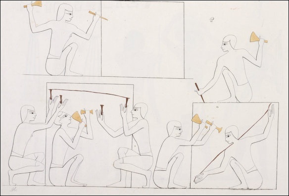 “There has been much debate concerning the techniques used by ancient Egyptians to cut and dress rough-quarried granite boulders or blocks for use in masonry. No remnants of the actual drilling equipment or saws have survived, leaving Egyptologists to make guesses about drilling and sawing techniques on the basis of tomb-scenes, or the many marks left on surviving granite items such as statues. |::|