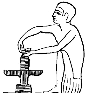 Various pictures of the time of the Old and the Middle Kingdom show us the potter at work. It was only the simplest vessels that were formed entirely by the hand. As a rule the potter's wheel was used, which was turned by the left hand, whilst the right hand shaped the vessel. The pots were then burnt in a stove which seems to have resembled that used by the Egyptian bakers. As is shown in our illustration, the fire was below, and the pots were placed either on the top or inside; in another picture we see the pots standing on the top apparently covered with ashes. '''