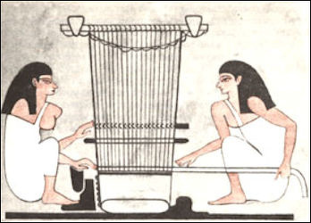 The operation of weaving was a very simple one during the Middle Kingdom. The warp of the texture was stretched horizontally between the two beams, which were fastened to pegs on the floor, so that the weaver had to squat on the ground. Two bars pushed in between the threads of the warp served to keep them apart; the woof-thread was passed through and pressed down firmly by means of a bent piece of wood. " A picture of the time of the New Kingdom however gives an upright loom with a perpendicular frame. The lower beam appears to be fastened, but the upper one hangs only by a loop, in order to facilitate the stretching of the warp. We also see little rods which are used to separate the threads of the warp; one of these [ certainly serves for a shuttle. A larger rod that runs through loops along the side beams of the frame appears to serve to fix the woof-thread, like the reed of our looms.