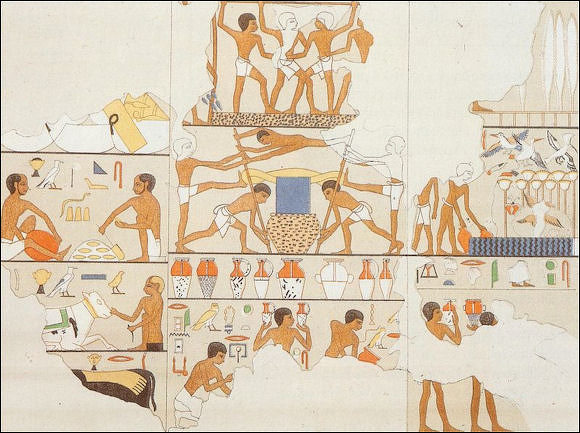 According to ancientegyptonline.co.uk: “According to legend, Osiris taught ancient Egyptians the art of brewing beer, but the brewing of beer was traditionally but not exclusively a female activity though which women could earn a little extra money (or bartered goods) for themselves and their families. The main ingredient in the beer was bread made from a rich yeasty dough possibly including malt. The bread was lightly baked and crumbled into small pieces before being strained through a sieve with water. Flavour was added in the form of dates and the mixture was fermented in a large vat and then stored in large jars. However, there is also evidence that beer was brewed from barley and emmer which was heated and mixed with yeast and uncooked malt before being fermented to produce beer. [Source: ancientegyptonline.co.uk ]