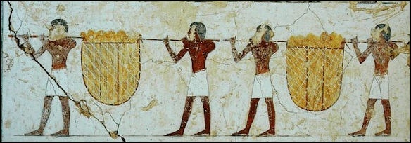 Workmen in the City of the Dead in Thebes received their rations each day whether they worked or not. Four times in the month they seem to have received from different officials a larger allowance (perhaps 200-300 kilograms) of fish, which appears to have formed their chief food. [Source: Adolph Erman, “Life in Ancient Egypt”, 1894]