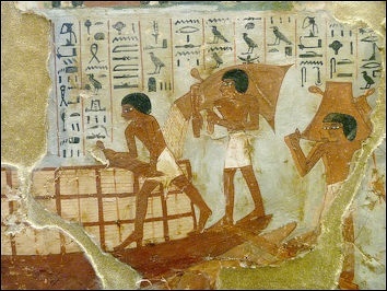 For much of the year it seems that most people in ancient Egypt were involved in agricultural activity of some kind, but during the flood (July- In ancient Egypt there was paid labor (usually through rations), corvée compulsory labor and slavery. In addition there were farmers, at least some of whom were also workers during the season when there was not much agricultural work to do. Ben Haring of Universiteit Leiden wrote: “An income strategy different from subsistence was labor, either voluntary or compulsory. Compulsory labor is known from ancient Egypt in two forms: corvée and slavery. Corvée (bH) is well attested as periodical compulsory labor (especially in earlier periods), and everyone but the highest functionaries could be subjected to it. In the Old Kingdom, groups of workers subject to this practice were called mrt and worked in agricultural domains founded by the government . The same word mrt was used for the personnel of temple workshops in the New Kingdom; these were often prisoners taken during military campaigns. In the Middle Kingdom, temporary compulsory labor on state fields was controlled by the xnrt (interpreted as "labor camp" by Quirke). Even the nmH(y) of the New Kingdom (see Institutional and Private Interests above) could be summoned for service to government officials, as becomes clear from the decree of King Horemheb.” [Source: Ben Haring, Universiteit Leiden, Netherlands, UCLA Encyclopedia of Egyptology 2009, escholarship.org ]