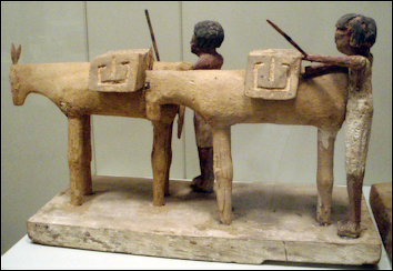 Cattle were part of the staple diet of the Egyptians, suggesting that grazing land was available for the Egyptians during the times when the Nile receded. However, during the inundation, cattle were brought to the higher levels of the flood plain area and were often fed the grains harvested from the previous year.” [Source: Minnesota State University, Mankato, ethanholman.com]