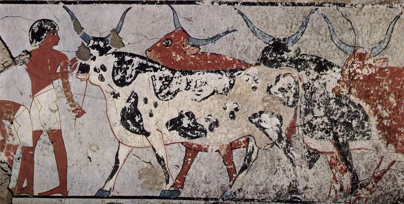 Cattle-breeding was widely practiced in Ancient Egypt. There are many pictures of cattle, especially from of the Old Kingdom. Egyptians talked to their cattle as we talk to our dogs; they gave them names and decked out the finest with colored cloths and pretty fringes; they represented their cattle in all positions with an observation both true and affectionate, showing plainly how dearly they valued them. Bulls were treated with reverence by Egyptians (black bulls in particular were given harems and palaces because they were believed to be related to the bull-god Apis).