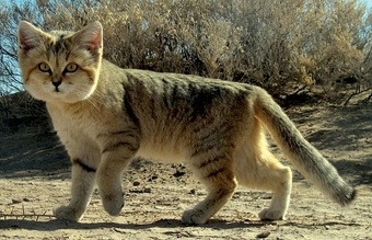 Sand cats (Felis margarita) are housecat-size predators found in the northern Sahara, the Middle East, Central Asia and Pakistan. Little is known about because them because they are shy, active mostly at night and their habitat is so harsh and unwelcoming to humans. They are rarely seen. Few live beyond a year in captivity. [Canon advertisement in March 1993 National Geographic].