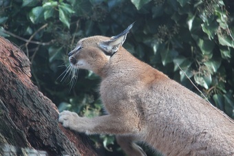 Caracals (Caracal caracal) are the largest of the small wild cats. They are nocturnal predator with distinctive long ears that have long tufts of black hair at their tips. They stand about 37 to 50 centimeters (15 to 20 inches) at the shoulder, weigh 11 to 20 kilograms (25 to 45 pounds) and reach lengths of 1.3 meters (four feet) including a 30 centimeter (one foot) tail. They vary in color from silver grey to tawny to brick red.
