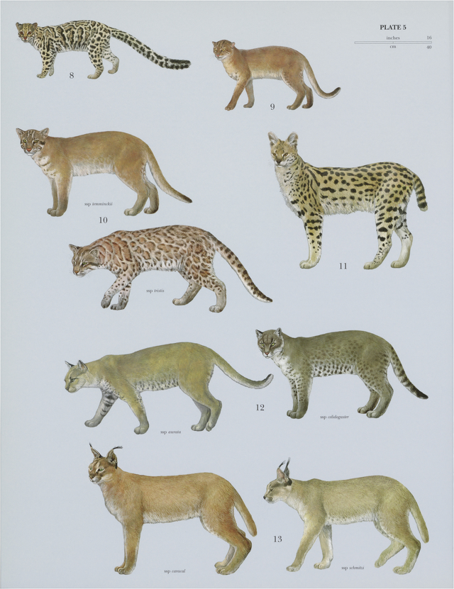 Caracal and some of its relatives: 8) Marbled Cat (Pardofelis marmorata), 9) Bay Cat (Catopuma badia), 10) Asian Golden Cat (Catopuma temminckii), 11) Serval (Leptailurus serval), 12) African Golden Cat (Profelis aurata), 13) Caracal (Caracal caracal)