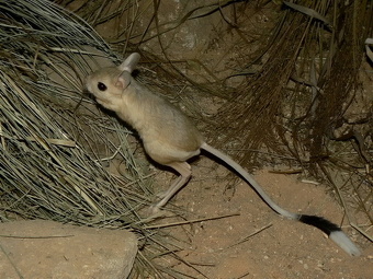 Jerboas feed on insects, seeds, and succulent vegetation. In many ways they are remarkably similar to the kangaroo rats (Heteromyidae) of North America. Both have greatly inflated bullae; a very long tail, often tipped black and white; fused or nearly fused cervical vertebrae; and soft, silky fur, usually pale in color. They both employ leaping locomotion that utilizes their enlarged and powerful hind feet. This is a type of movement is found in many desert rodents and is thought to be beneficial because, although it often wastes energy, it allows an animal to move quickly, change direction rapidly, and even jump up to avoid predators like snakes. This is important in desert environments where there is little cover. [Source: Sharon Jansa, Janae Chavez, Phil Myers, Animal Diversity Web (ADW) /=]