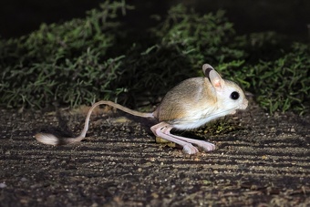 Jerboas are hopping desert rodents found throughout North Africa, the Middle East and Central Asia that belong to the family Dipodidae. They tend to live in hot deserts, are generally nocturnal and can move very quickly. When chased, jerboas can run or hop at up to 24 km/h (15 mph). Most species of jerboas have excellent hearing that they use to locate prey and to avoid becoming prey themselves to predators such as little owls. The typical lifespan of a jerboa is around two to three years. [Source: Wikipedia]
