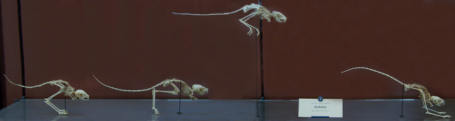 Lesser Egyptian jerboa skeletons showing a jump movements sequence, Muséum national d'histoire naturelle, Paris