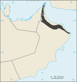 Arabian tahrs are currently found in the Hajar Mountains of the United Arab Emirates and the northern parts of Oman at elevations from 1000 to 1800 meters (3281 to 5905 feet) at an average elevation of 1200 meters (3937 feet). Their current known range is 8,863 square kilometers, and the total possible range is 15,787 square kilometers. They inhabit north slopes of the Hajar Mountains and Musandan masifs, where they favor steep ground. Tahrs occupy the relatively rainy slopes of these mountains which contain enough water and diverse vegetation for them to survive. At the bottoms of these mountains, water sources in valleys, called wadis, are important for the survival of Arabian tahrs.