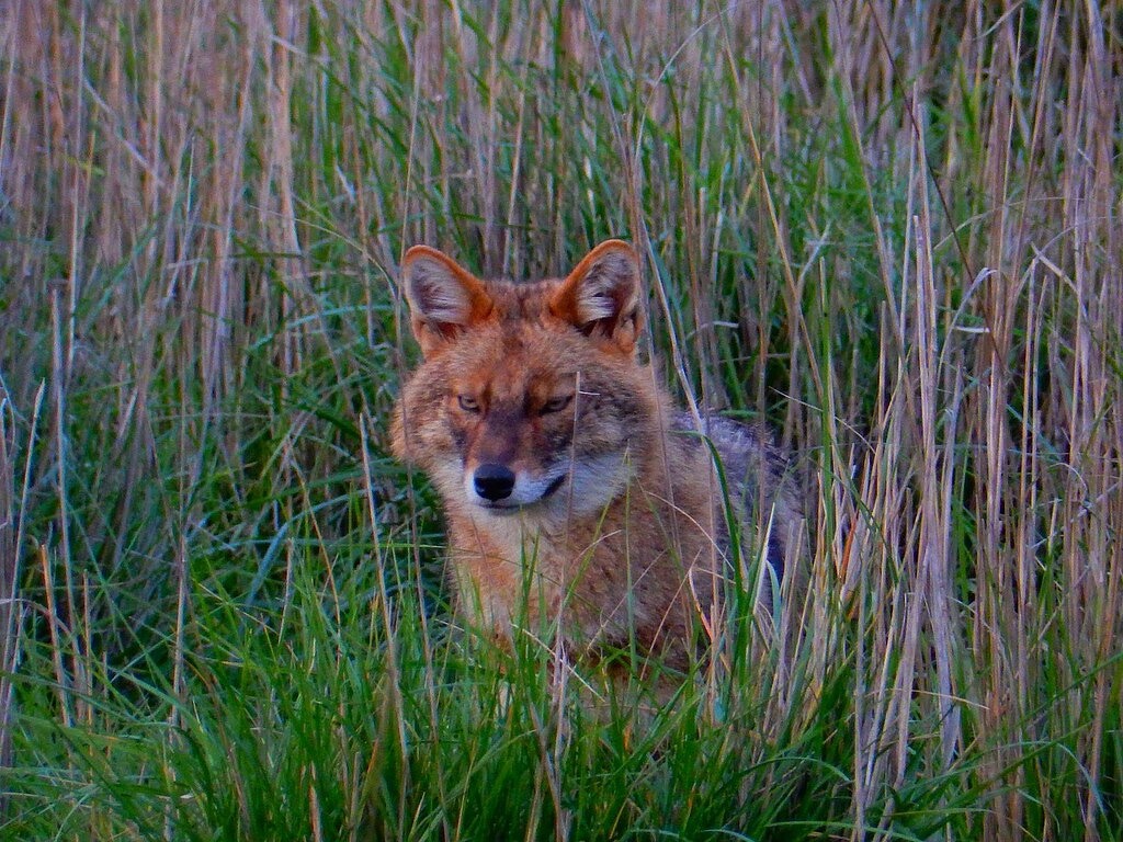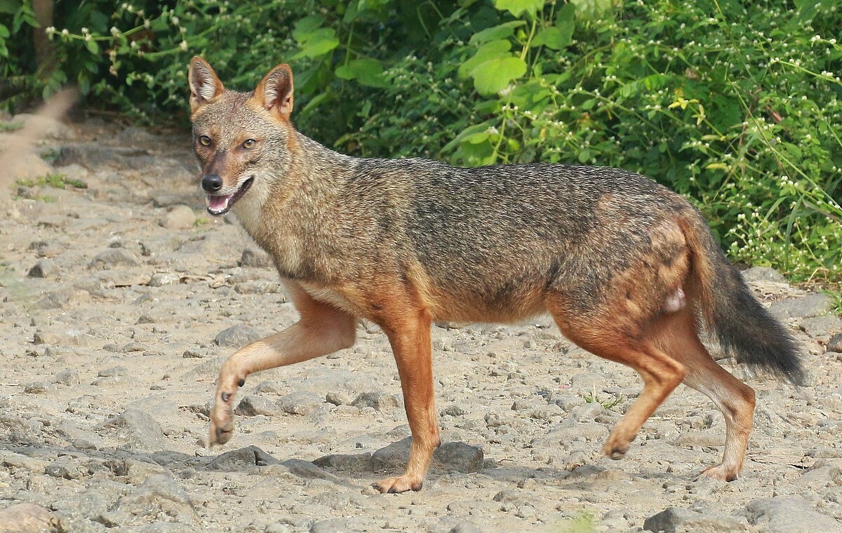 Golden jackals (Canis aureus) are also called common jackals. They are coyote-like or wolf-like canids native to Eurasia and found in Europe and Africa. Compared to Arabian wolves, which are a subspecies of gray wolves, golden jackals are smaller and have shorter legs, a shorter tail, a more elongated torso, a less-prominent forehead, and a narrower and more pointed muzzle. On the International Union for Conservation of Nature (IUCN) Red List, they are listed as a species of Least Concern due to its widespread distribution and high density in areas with plentiful food.