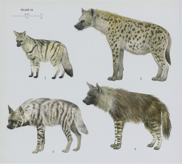 Hyena species: 1) Aardwolf (Proteles cristata), 2) Spotted Hyena (Crocuta crocuta), 3) Striped Hyena (Hyaena hyaena), 4) Brown Hyena (Parahyaena brunnea)