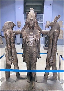 On the fight between Horus and Seth at the beginning of creation, Lee Huddleston of the University of North Texas wrote: “Father Geb faced a unique problem. Atum had resigned his rule to his only son, Shu; Shu in turn gave way for his only son, Geb. Geb had two sets of twins from Nut's one pregnancy. When it came time for him to turn over control of earth [EGYPT], he had two sons from which to choose the next ruler. Some stories suggest he may have divided Egypt; others say he gave it all to Osiris and gave the rest of the world to Seth. Whatever the circumstance may have been, Seth was unhappy with his lot. He murdered his brother, Osiris; cut his body into small pieces, and threw them into the NILE. There, Osiris merged with, and became the River. Isis, assisted by her sister, Nepthys, found all the pieces of Osiris except the phallus. Isis hovered over him imploring him to arise and impreg-nate her. Miraculously, Osiris did revive, and did impregnate his wife before passing to the West, the home of Atum, where he became the Spirit in whom the souls of the righteous dead would eventually find salvation. [Source: Lee Huddleston, Ancient Near East Page, January, 2001, Internet Archive, from UNT \=/]