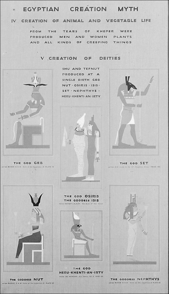 “The Hand of Atum. Finding himself alone, Atum used his hand and begat, then brought out of himself, the first generation of Gods: a) Shu [Air], and his sister/wife Tefnut [Ma'at/ Mayet]. The root meaning of Ma'at is right-thinking or Order, but she was also Space. They then wandered off into the endless body of Nun. Atum sent Eye to find them and return them. While Eye was gone, Atum created a second eye, possibly the Moon. When Shu and Tefnut returned, Tefnut gave birth to b) Geb [Earth], and his sister/wife b) Nut [Sky]. Geb and Nut were born in sexual embrace. Shu forcibly interposed himself between them, thus separating Earth from Sky. Nut gave birth to two sets of twins: d) Osiris [the Nile, God of the Dead] and his sister e) Isis, who was his wife [the Fertile soil, the star Sirius]; f) Seth [Disorder, Foreign Places], brother to Nepthys, his wife, and to Osiris and Isis. The son of Isis and Osiris was g) Horus [the Pharaoh, the Fruit of the Land]. An older God, h) Thoth, who was reborn as the son of Horus and Seth, was the Law [of God], the Word [of God], the Seed [of God]. \=/