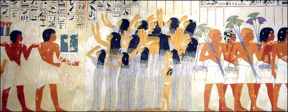 Squatting near the body are the women relations of the deceased with their breasts bare, lamenting him; the funerary priest makes offerings and burns incense before the mummy. His official recitation, “an incense offering to thee, O Harmachis-Khepri, who art in the bark of Nun, the father of the gods, in that Neshmet bark, which conducts thither the god and Isis and Nephthys and this Horus, the son of Osiris," contrasts strangely with the lamentations of the women who, while they grieve that their husband and father has forsaken them, have no understanding of the subtle mysticism of these ceremonies. [Source: Adolph Erman, “Life in Ancient Egypt”, 1894]
