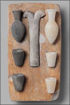 “1) Purification and Libation: a) Flasks with ovoid bodies and tall narrow necks were part of a hand-washing set during the Middle and New Kingdom: a person stretched his/her hands over a basin while a servant poured water over them from a flask. This mundane activity became a ritual when connected to an offering ceremony. B) Beakers and jars with wide necks were commonly used as containers of liquids and people also drank from them. Representations of purification rituals, however, also show them in use for pouring water over the heads of persons and mummies during purification rites. Between forty and fifty miniature basins were found in KV 54. They are shaped like the tubs in which priests washed before entering a temple or tomb for service. Their small size (around 5 1/2 to 6 inches [14–15.2 cm]) and friable material (unfired clay) made them purely symbolical objects. \^/