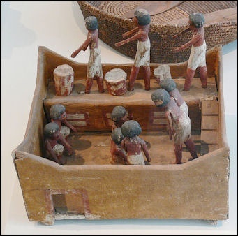From picture from Tell el Amarna we can see in what grand style an Egyptian lord lived, and we may be sure that he required a vast number of servants. Our knowledge of these dependants is gleaned chiefly from the details that we have of the courts of the nomarchs of the 12th dynasty. The chief of the household consisted of an old “superintendent of the provision house," who had the charge of the store-rooms. He had the supervision of the bakery as well as of the slaughter-house, and grew so stout in the exercise of his duties that at the funeral festival of his master he was not able to carry his own offering. " [Source: Adolph Erman, “Life in Ancient Egypt”, 1894]