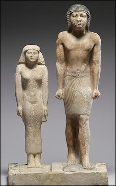 “The show...opens with an Old Kingdom limestone effigy of a man and a woman standing together. Their torsos are sensually modeled, their facial features regular but individualized, melding the ideal with the real. Their pose is unabashedly affectionate: her arm encircles his waist, his hand passes over her shoulder and touches her breast. But distinctions between the figures are marked. The man, in every way the dominant figure, is a full head taller than his mate. Where his face is upward-looking and warmed by a faint but self-confident smile, hers seems pensive. She gazes slightly downward and to the side, tensed, as if listening for something. What could it be? The cry of unruly children? The clatter of plates in a kitchen? The hum of weaving in a distant room? The pulse of life beating in the earth? ~