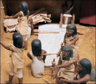 Ben Haring of Universiteit Leiden wrote: “The principal production and revenues of Egyptian society as a whole and of its individual members was agrarian, and as such, dependent on the yearly rising and receding of the Nile. Most agricultural producers were probably self-sufficient tenant farmers who worked the fields owned by wealthy individuals or state and temple estates. In addition to these, there were institutional and corvée workforces, and slaves, but the relative importance of these groups for society as a whole is difficult to assess. According to textual evidence, crafts were in the hands of institutional workforces, but indications also exist of craftsmen working for private contractors. [Source: Ben Haring, Universiteit Leiden, Netherlands, UCLA Encyclopedia of Egyptology 2009, escholarship.org ]