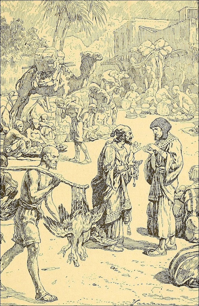 The remarkable pictures in a tomb at Saqqara show us the scenes of daily life in a market of the time of the Old Kingdom; they represent a market such as would be held on the estate of a great lord for his servants and his peasants. The fish-dealer is sitting before his rush basket, he is busy at this moment in cleaning a great sheath-fish, while he haggles about the price with his customer. The latter carries her objects for barter in a box, and is very far from being silent — she is holding a long conversation with the salesman as to how much she “will give for it. " Near this group another tradesman is offering ointment or something similar for sale. Another is selling some objects that look like white cakes; the collarette which is offered him for one of these does not seem to him to be enough. “There (take) the sandals (as well)," says the buyer, andthus the bargain is brought at last to a conclusion. Brisk business is being carried on round the greengrocer. One customer is buying vegetables in exchange for a necklet, and the dealer assures him: “See I give the (full) value”; another customer comes up at the same moment, in the hope of buying his meal of onions in exchange for a fan. Vegetables, however, are not the only things sold here; there is another dealer squatting before his basket of red and blue ornaments, he is bargaining with a woman who wants to buy one of his bright strings of beads. By her side is a man with fish hooks (?) who seems to be vainly pressing his wares on another man standing by.