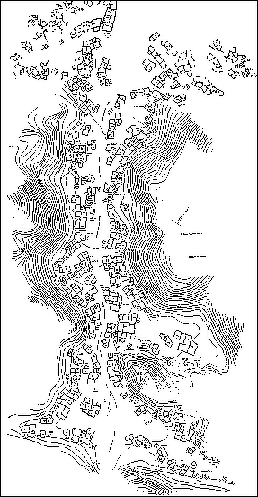 At Bir Umm Fawakhir's main settlement, the plaza area is surrounded by buildings 92, 100, 101, 102, 99, 97, and part of 93. Granite Quarry 2 lies at the foot of the hill on the left. The main street runs northwest toward the modern road and settlement. The Roman watch tower is on the mountain top at the far upper right. Scattered around the houses are a number of one-room outbuildings: a smaller, rounded type and a larger, rectangular kind. Without excavation, it cannot be determined whether the outbuildings were used for kitchens, workshops, animals, storage, latrines, or something else. |