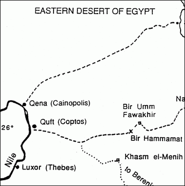 Carol Meyer of the University of Chicago wrote: “Bir Umm Fawakhir lies in the rugged Precambrian mountains of the central Eastern Desert and is almost exactly halfway between the Nile and the Red Sea. The site is approximately 65 kilometers (two and a half to three days by camel) from Quft (ancient Coptos). This route, which is the shortest from the Nile to the Red Sea, has been in use for at least 5,000 years and follows a series of wadis (dry canyons) cutting through the mountains. The most famous ancient site enroute is the Wadi Hammamat, which was the source of a fine-grained dark graywacke that was highly prized in pharaonic times for statues, sarcophagi, and the like. [Source: Carol Meyer, Oriental Institute, University of Chicago, “Bir Umm Fawakhir: Insights into Ancient Egyptian Mining JOM 9:3 (1997), 64-68, JOM |]