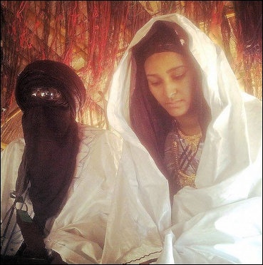 During a Tuareg wedding, the bride is dressed up in an elaborate costume and gets on a donkey loaded with carpets and pillows and other gifts. The bride travels with a small caravan of family members dressed in their finest clothes across the desert to the groom’s camp. In accordance with Tuareg tradition, marabaouts perform a marriage rite in a local mosque attended by the parents but not the bride and groom.