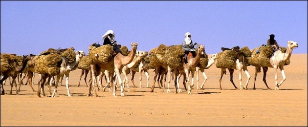 In 1965 Belgian anthropologist Victor Englebert accompanied a Tuareg caravan on a 600-kilometers journey from the salt pits of Bilma in the heart of the Sahara in eastern Niger to Agadez, a Nigerien town on the threshold of the Sahara and the Sahel. Once caravans with 30,000 camels traversed this route but by the 1970s the handful of caravans that remained had only a few hundred animals. The salt caravans remained profitable because the transportation cost of bringing salt from the sea or an African port was prohibitively expensive. There was biannual 3,000-camel caravan that ran between Timbuktu and the salt mines of Taoudenni in northern Mali that was operating until relatively recently. It may still be going. [Source: "The Essence of Life: Salt" by Gordon Young, National Geographic, September 1977]