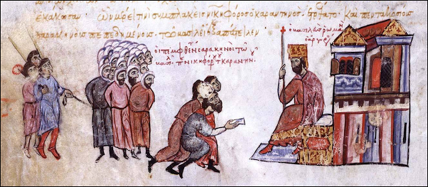 Arab captives brought before Byzantine Emperor Romanos III in the 11th century