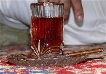 Egyptians drink heavily sugared hot tea from glasses. In Iran small glasses of tea are served at most social and business gathering. Iranian tea is very strong and served piping hot with sugar, which some people put in their tea and others stick in their mouth and suck tea through it. Many drink endless cups of tea at tea houses, many of which also offer water pipes. As rule milk isn’t offered with tea. Omanis like tea flavored with mint, cloves, cardamon or cinnamon. In Iraq, tea is dark, very sweet and served in half-filled glasses. There is a tinkling sound made when the sugar is mixed in the glass. Small glasses of tea are served at most social and business gathering. Iraqi tea is often very sweet and/or flavored with cardamom and is served piping hot. In Tunisia sweet, sugary tea is often spiced with mint and sometimes with pine nuts,