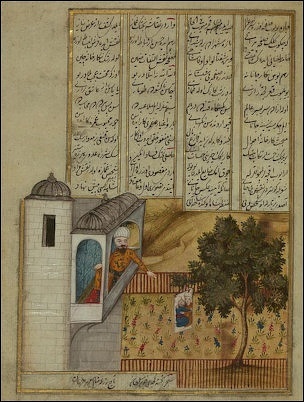 A king looking at a picture of his son and his tutor who fell in love with him