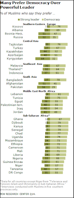 Democracy has foundations in Islam. Islamic law promotes the idea of reach decision through a “consensus.” The early caliphs were elected by a majority. The primary difference between Islamic democracy and Western democracy is the former serves God and the latter serves the people, a blasphemous idea to conservative Muslims. Many Arab leaders approach democracy in a limited form that keeps them in power but eases simmering tensions.
