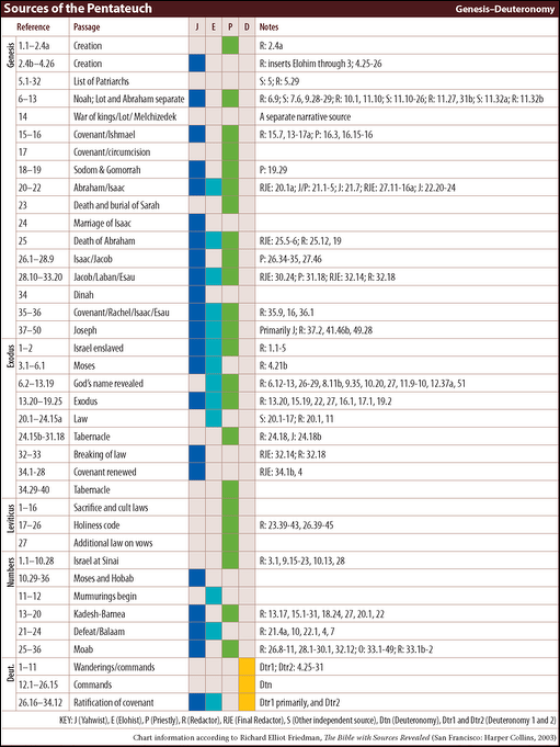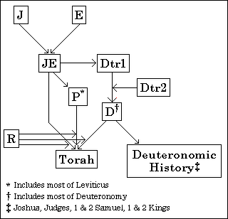 “The combining of the various sources was believed to be the work of redactors. Rje, the editor who united J and E around 650 B.C. provided connecting links to harmonize the materials where essential. Rd added the Deuteronomic writings to the combined JE materials about 550 B.C., forming what might be termed a J-E-D document. P was added about 450-400 B.C. by Rp, completing the Torah. This hypothesis, by which the contradictions, doublets, style variations, and vocabulary differences in the Pentateuch were explained, can best be represented by a straight line.