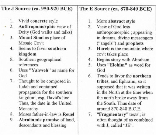 Gerald A. Larue wrote in “The thesis known as the Graf-Wellhausen theory, or as the Documentary Hypothesis, still provides the basis upon which more recent hypotheses are founded. The Graf-Wellhausen analysis identified four major literary sources in the Pentateuch, each with its own characteristic style and vocabulary. These were labeled: J, E, D and P. The J source used the name "Yahweh" ("Jahveh" in German) for God, called the mountain of God "Sinai," and the pre-Israelite inhabitants of Palestine "Canaanites," and was written in a vivid, concrete, colorful style. God is portrayed anthropomorphically, creating after the fashion of a potter, walking in the garden, wrestling with Jacob. J related how promises made to the patriarchs were fulfilled, how God miraculously intervened to save the righteous, or to deliver Israel, and acted in history to bring into being the nation. E used "Elohim" to designate God until the name "Yahweh" was revealed in Exod. 3:15, used "Horeb" as the name of the holy mountain, "Amorite" for the pre-Hebrew inhabitants of the land, and was written in language generally considered to be less colorful and vivid than J's. E's material begins in Gen. 15 with Abraham, and displays a marked tendency to avoid the strong anthropomorphic descriptions of deity found in J. Wellhausen considered J to be earlier than E because it appeared to contain the more primitive elements. [Source: Gerald A. Larue, “Old Testament Life and Literature,”1968, infidels.org ]