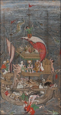 The Koran story of Noah goes: “Prophets are the messengers of Allah who came from time to time to guide mankind to the way of Allah, the path of righteousness. Amongst the many who came as guides and warners to the people, Prophet Noah (Alaihisalam) was one of them. He lived long before the time of our Holy Prophet Muhammad (Salallahu alaihi wasalam), the last of the prophets. God appointed Noah as the prophet for his people, so as to guide them to the right path and turn them away from their evil ways. The Holy Qur’an tells us the story of Prophet Noah and his people in a number of suras [3], namely sura 57 (Nuh), sura 11 (Hud), and sura 23 (al-Mu’minun), and many ayats [4] therein. It tells us of the strong faith which the Prophet had in Almighty God and about the final destruction of those who ignored the Divine Message. [Sources: Holy Qur’an with narritive filled in by Jehangir A. Merchant, simerg.com, October 4, 2011 |~|]