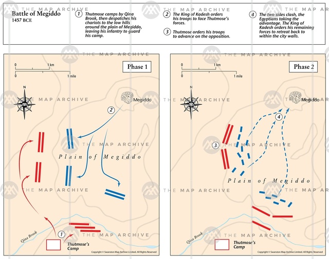 In 1458 B.C , armies of chariots and 10,000 foot soldiers under Thutmose III thundered through Gaza and defeated a coalition of Canaanite chiefdoms at Megiddo, in what is now northern Israel. This campaign, which is recorded in great detail on the walls of the temple he built in Karnak, revealed Tuthmosis III as a military genius.
