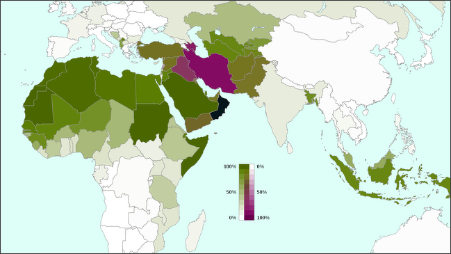 Islam by country: Sunni (Green); Shia (Shiite, Purple), Ibadi (blackish green)