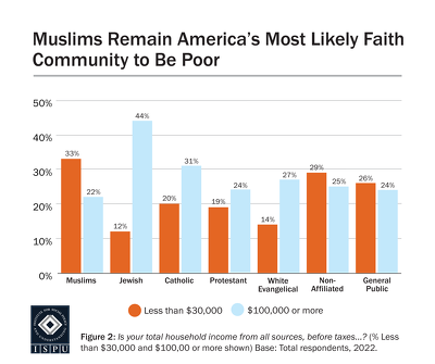 At one time the average income of Muslim Americans was higher than that of total American population but maybe that s no longer the case. According to Pew: Financially, Muslims are about as likely as Americans in general to have a household income over $100,000. At the same time, they are more likely than Americans in general to have an income under $30,000. The survey also finds that Muslims are three times as likely as other Americans to be without a job and looking for work. [Source: Pew Research Center, July 26, 2017]