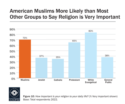Roughly two-thirds of U.S. Muslims (65 percent) say religion is very important in their lives. About six-in-ten (59 percent) report praying at least daily and 43 percent say they attend religious services at least weekly. By some of these traditional measures, Muslims in the U.S. are roughly as religious as U.S. Christians, although they are less religious than Muslims in many other nations.