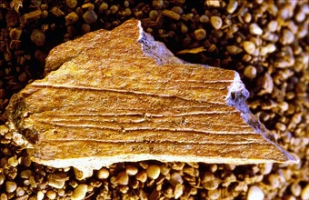 Some of the world's earliest evidence of modern human art, jewelry, arrows and other things come from Blombos Cave (See links below). A team led by Christopher Henshilwood of the State University of New York and Judith Sealy of the University of Capetown have found interesting , well-preserved 70,000-year-old artifacts in Blombos Cave thought to have been produced by modern humans. The cave was used off and on by groups of modern humans for tens of thousands of years, then sealed shut for 70,000 years, only opening up again about 3,000 years ago, which explains why the objects found inside are so well preserved. [Source: Rick Gore, National Geographic, July 2000]