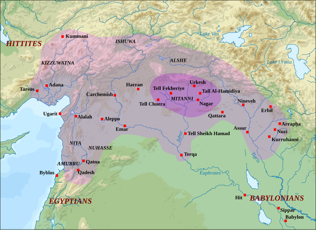 Mitanni was a powerful Hurrian-speaking state in northern Syria and southeast Anatolia (modern-day Turkey), with Indo-European linguistic and political influences, that existed from around 1550 to 1260 B.C.. No histories, royal annals or chronicles have yet been found in its excavated sites, thus knowledge about Mitanni is limited compared to the other states in the region and is mainly based on what their neighbours said about them. They were called called abigalbat in old Babylonian texts, Hanigalbat or Hani-Rabbat in Assyrian records,[b] or Naharin in Egyptian texts, The Hurrians were in the region as of the late 3rd millennium B.C.. Later, Hurrians made up the main population of Mitanni. [Source: Wikipedia]